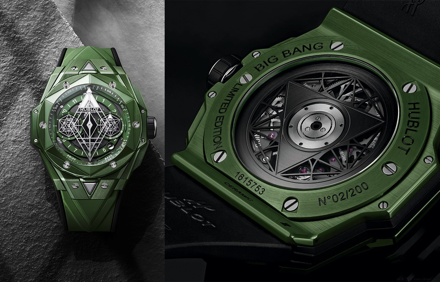 The new timepiece masterpiece has a case diameter of 45 mm and is made of magic gold or ceramic. The tattoos of the master tattoo artist alternately appear on the case and bezel, and the mechanism and disc hands feature geometric tattoos that continue to the rubber strap. Thanks to this geometric design, the mechanical beauty of the HUB1240 factory-made self-winding Unico chronograph movement can be seen through the skeletonized dial and transparent caseback. The Big Bang Unico SANG BLEU II Tattoo Watch Magic Gold is limited to 100 pieces, the black magic model made of all-black ceramic is limited to 250 pieces, and the green ceramic model is limited to 200 pieces.